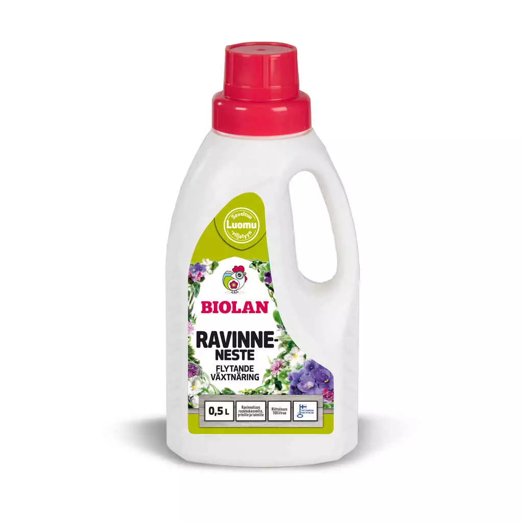 Biolan Ravinneneste on kasteluveteen lisättävä, eloperäinen ravinneliuos ruukkukasveille. Ravinnenesteessä on uusi tehokkaampi koostumus (NK 2-3). Se sopii kaikille ruukkukasveille, yrteille ja taimille