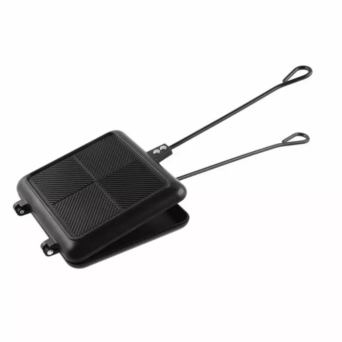 Valualumiinista valmistettu voileipägrilli, jossa on tarttumaton pinnoite. Grilliosan koko 20 x 18 cm. Kahvan pituus 30 cm. Sisältää kantolaukun.