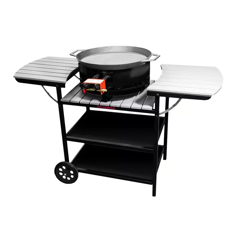 Vaunun pyörät helpottavat liikuttelua ja vaunun sivutasot tuovat lisätilaa ruoanlaittoon.