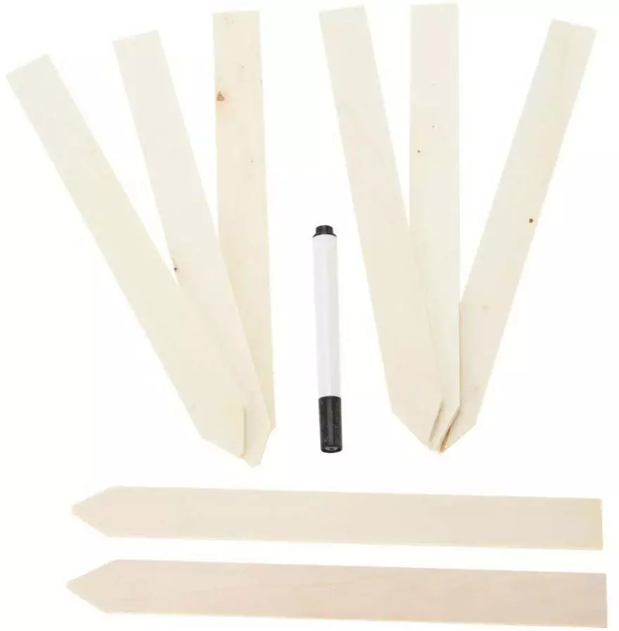 Pakkaus sisältää 8 kpl nimisäleitä ja 1kpl tussin taimien merkkaukseen.Pituus 20 cm, leveys 2 cm, paksuus 2 mm.