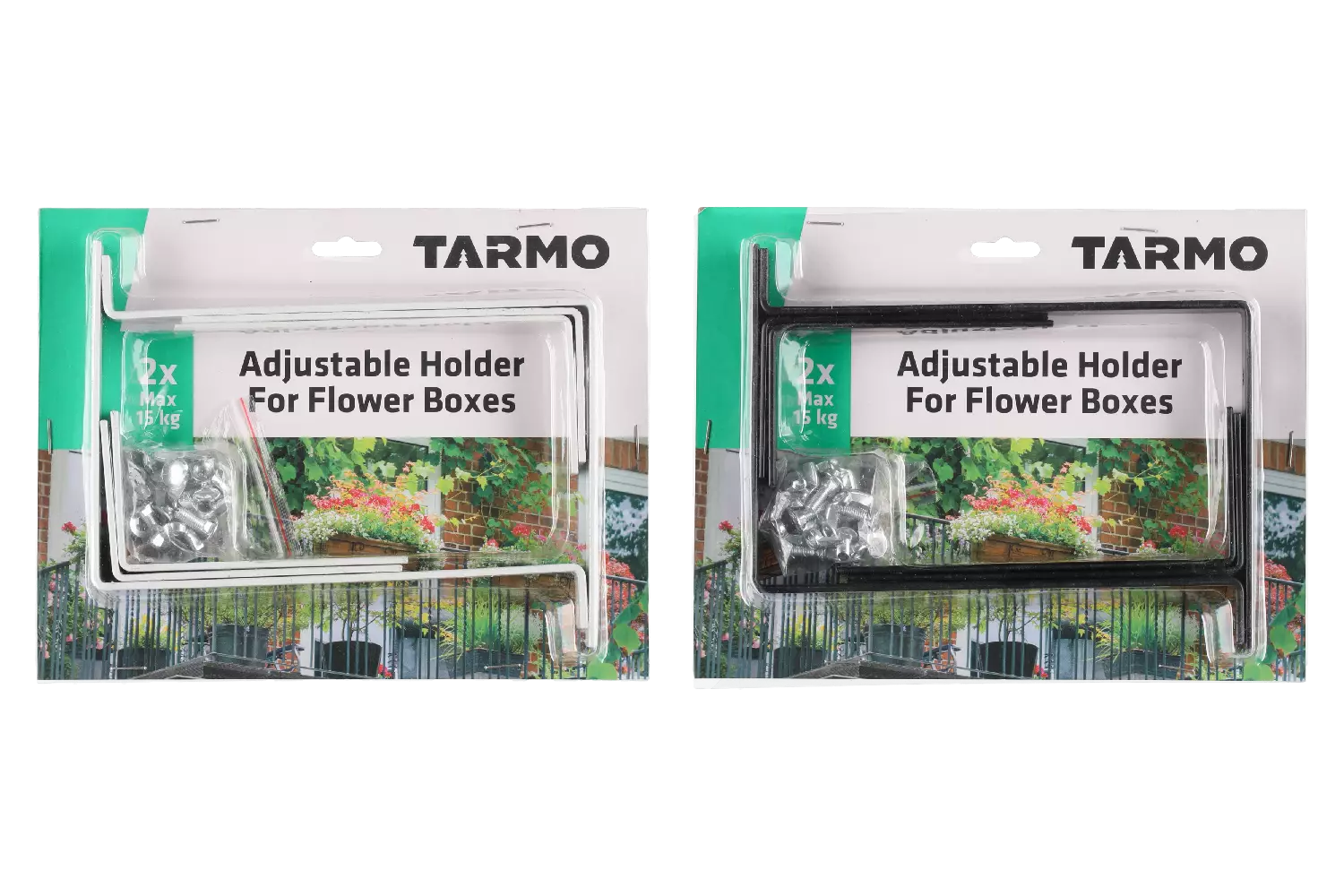 Teräksinen kannake parvekelaatikoille. Säädettävä malli parveke- ja terassikaiteille, joiden kaideleveys on 3 - 10 cm. Kaiteen enimmäispaksuus 6 cm. Kukkalaatikon enimmäissyvyys 17 cm. Enimmäiskantavuus 15 kg.
