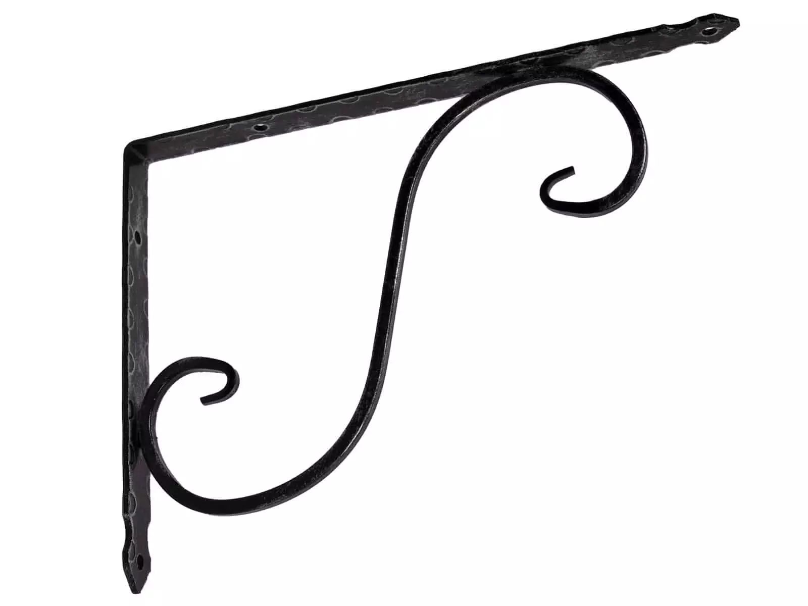 Kauniisti muotoiltu, tyyliltään taotun mallinen kannatin on antiikkimustaa metallia.