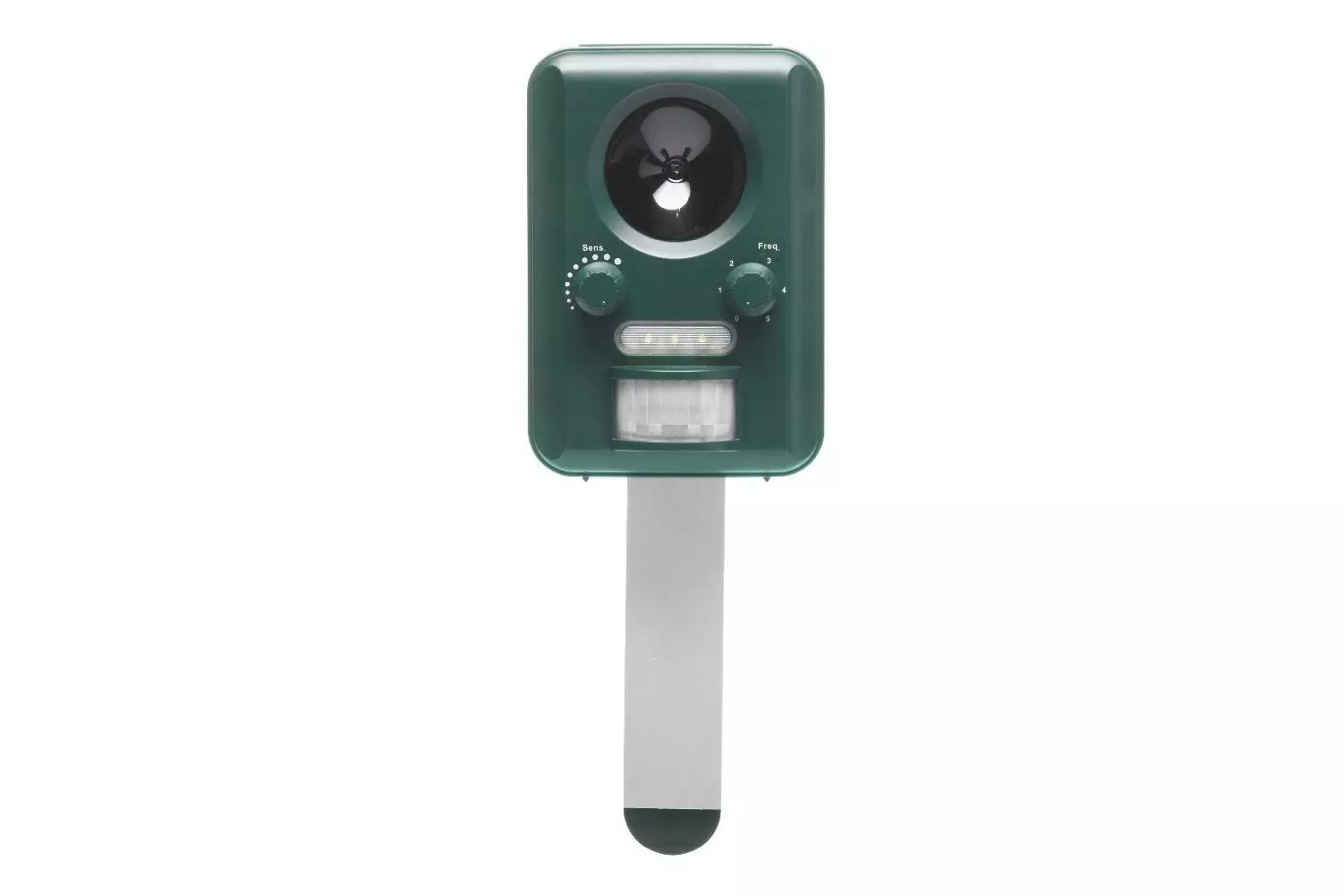 Eläinkarkoitin ulkokäyttöön. Säikäyttää eläimet kolmella eri tavalla: jatkuvan ultraäänen, vilkkuvan valon ja peilin yhteisvaikutuksella. Kaikki ominaisuudet aktivoituvat kun eläin saapuu liiketunnistimen alueelle. Kolme eri taajuusaluetta 13,5 kHz-17,5 kHz, 15,5-19,5 kHz ja 19,5-23,5 kHz erilaisten eläimien karkoittamiseksi. Voidaan asettaa yhdelle alueelle tai vuorotella eri taajuusalueiden välillä. Tehoalue 8 m ja havaintokulma 110 astetta. Karkotin torjuu mm. hiiret, kyyhkyt, varpuset, pienet jyrsijät, ketut, kissat ja koirat.