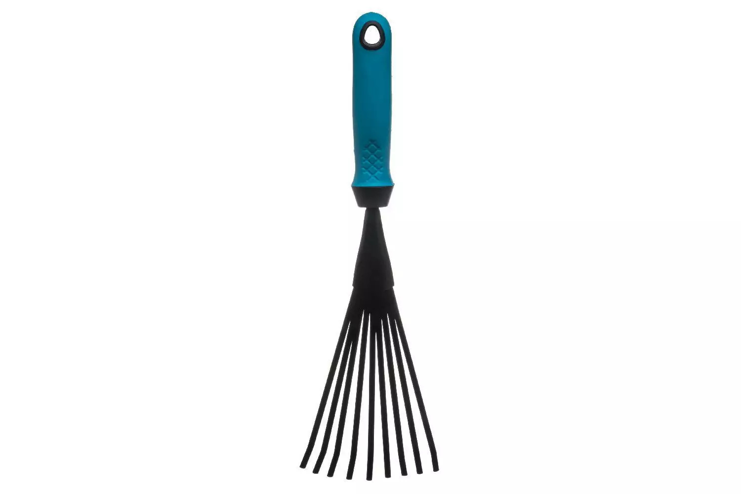 Lyhytvarsinen viuhkaharava/käsiharava on kätevä työkalu umpeen kasvaneille kukkapenkeille, terasseille ja parvekkeille. Mukava soft grip -kädensija.