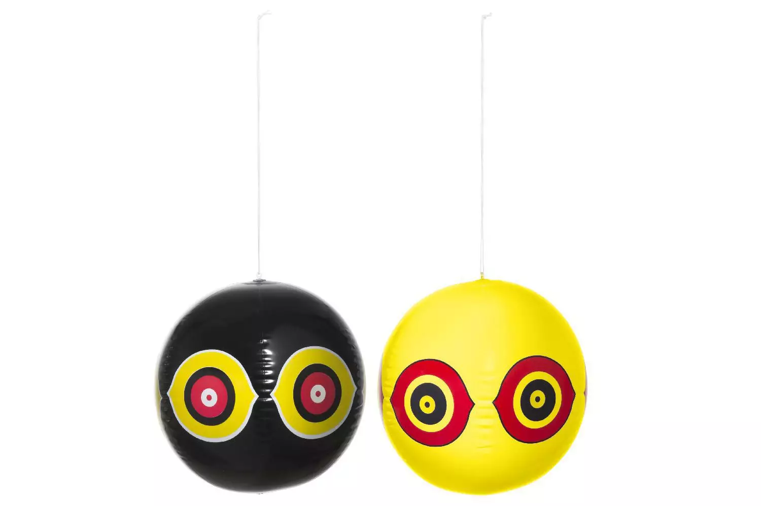 Linnunpelotinilmapallo, jossa suuret silmiä muistuttavat kuvioinnit. Mukana heijastavat tarrat silmiin sekä naru ripustamista varten.