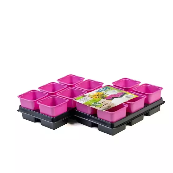 Pakkauksessa 12 kpl 8 cm pinkkejä ruukkuja ja 2 kpl mustia alustoja.
