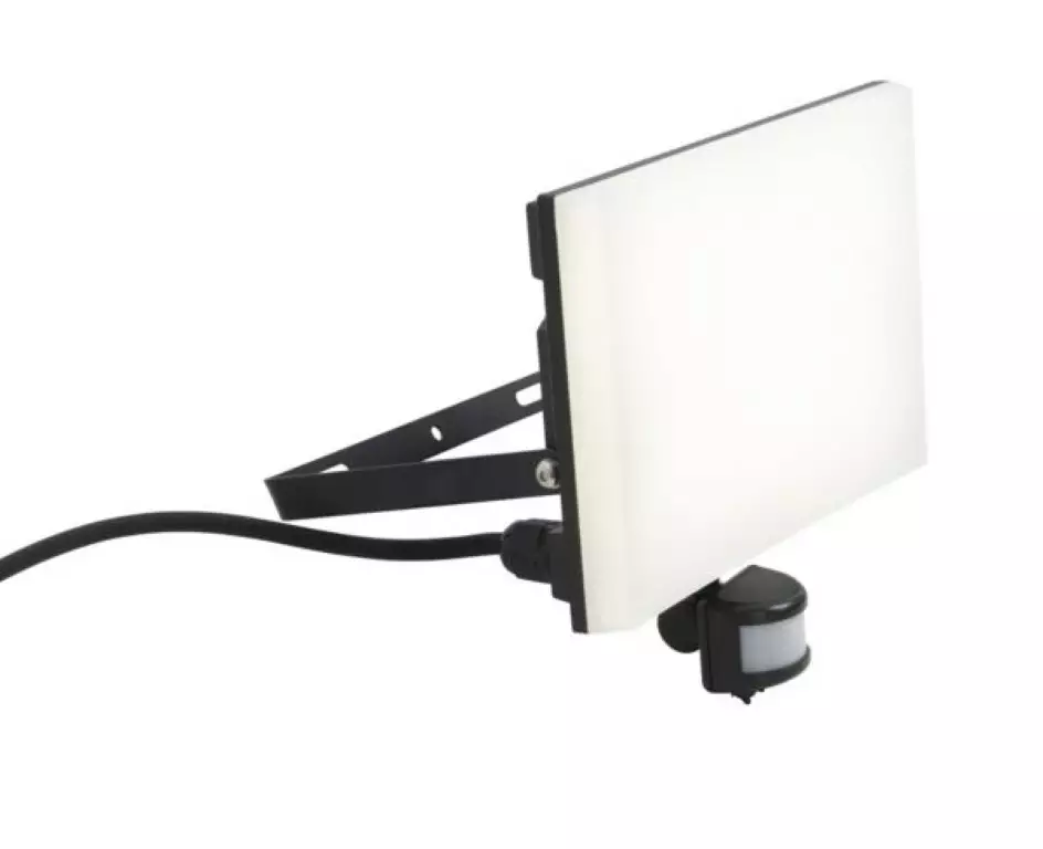 Airflood-valonheitin liiketunnistimella. Kiinteä led 50 W, 4000 K, 4000 lm, CRI>80, polttoikä 25 000 h. Avauskulma, erittäin leveä säde >80°. Ei himmennettävä. IP44, IK08.