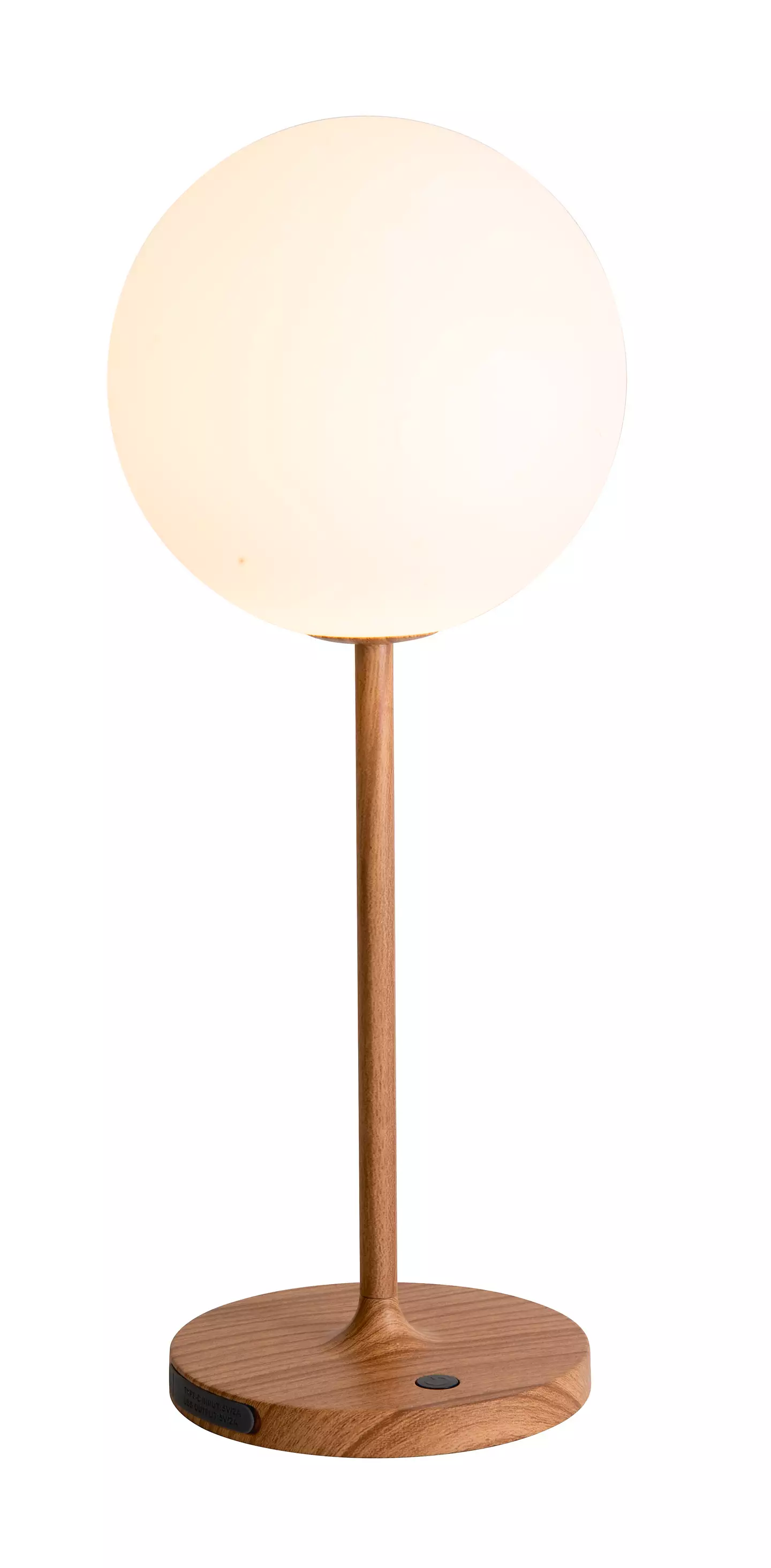 Upea ja tunnelmallinen 38 cm korkuinen pöytävalo. Metallivarsi, jonka pinta on puujäljitelmää. Varren päässä Ø 15 cm pallokupu, jonka läpi valkoinen valo kajastaa pehmeästi. Valaisimessa on USB-C latausportti, 1,2 m pituinen latausjohto sisältyy. Valoa voi himmentää portaattomasti kosketuskytkimestä.