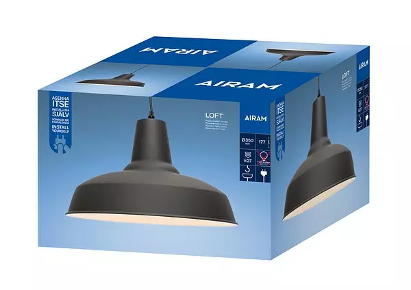 Teollisuusvalaisin-tyylinen Loft käy yleisvalaisimeksi mm. ruokailutilaan, keittiöön, olohuoneeseen ja makuuhuoneen. Varjostimen asennuskorkeuden valinnalla päätät kuinka laajasti valaiset tilaa. Varjostimen ja kattokupin himmeä metallipinta on maalarinvalkoinen tai mustanharmaa. Tekstiilipintaisessa kangasjohdossa on valmiina valaisinpistotulppa.