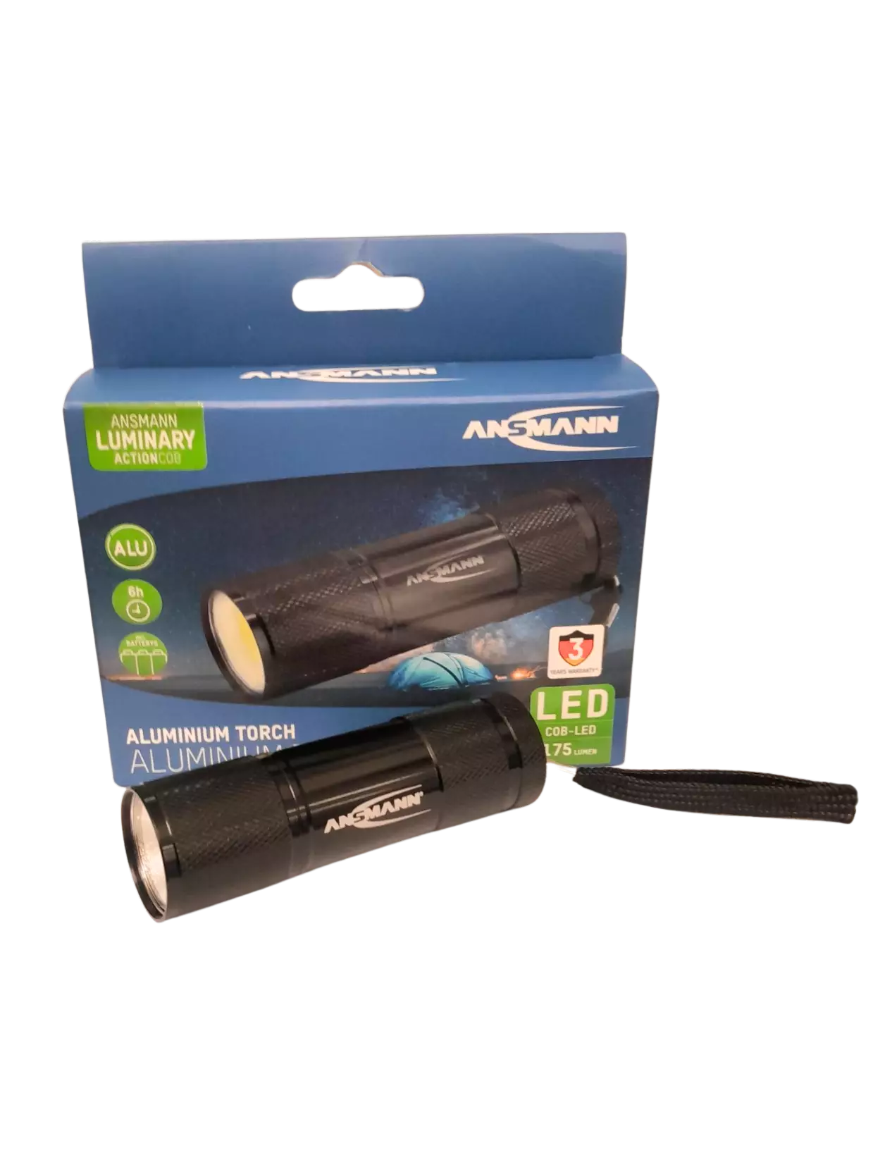 Alumiininen Ansmann taskulamppu 175lm. Käyttöaika 6 tuntia. Valokeilan pituus 19m. Kosteusluokka IPX3 Paino 42,5g
