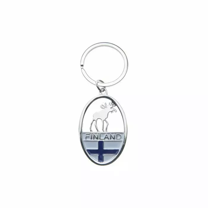 Metallinen litteä avaimenperä hirvenkuvalla ja Finland-tekstillä. Avainrengas.