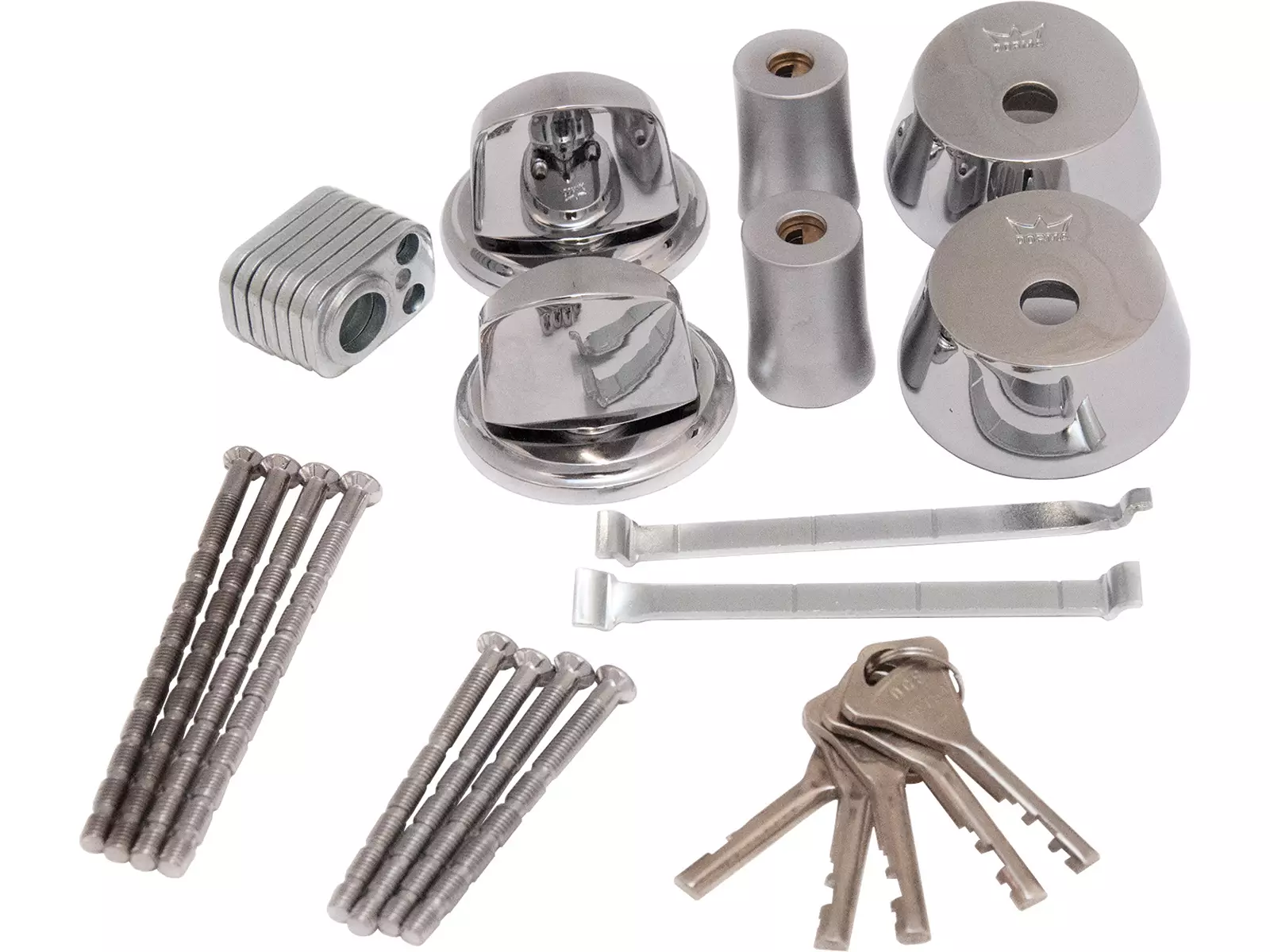 Täydellinen helasarja, joka sopii useimpiin ulko-oviin.Sisältää:avainpesät 2 kplvääntönupit, vääntöraudat, jatkokappaleet, ruuvit5 avainta
