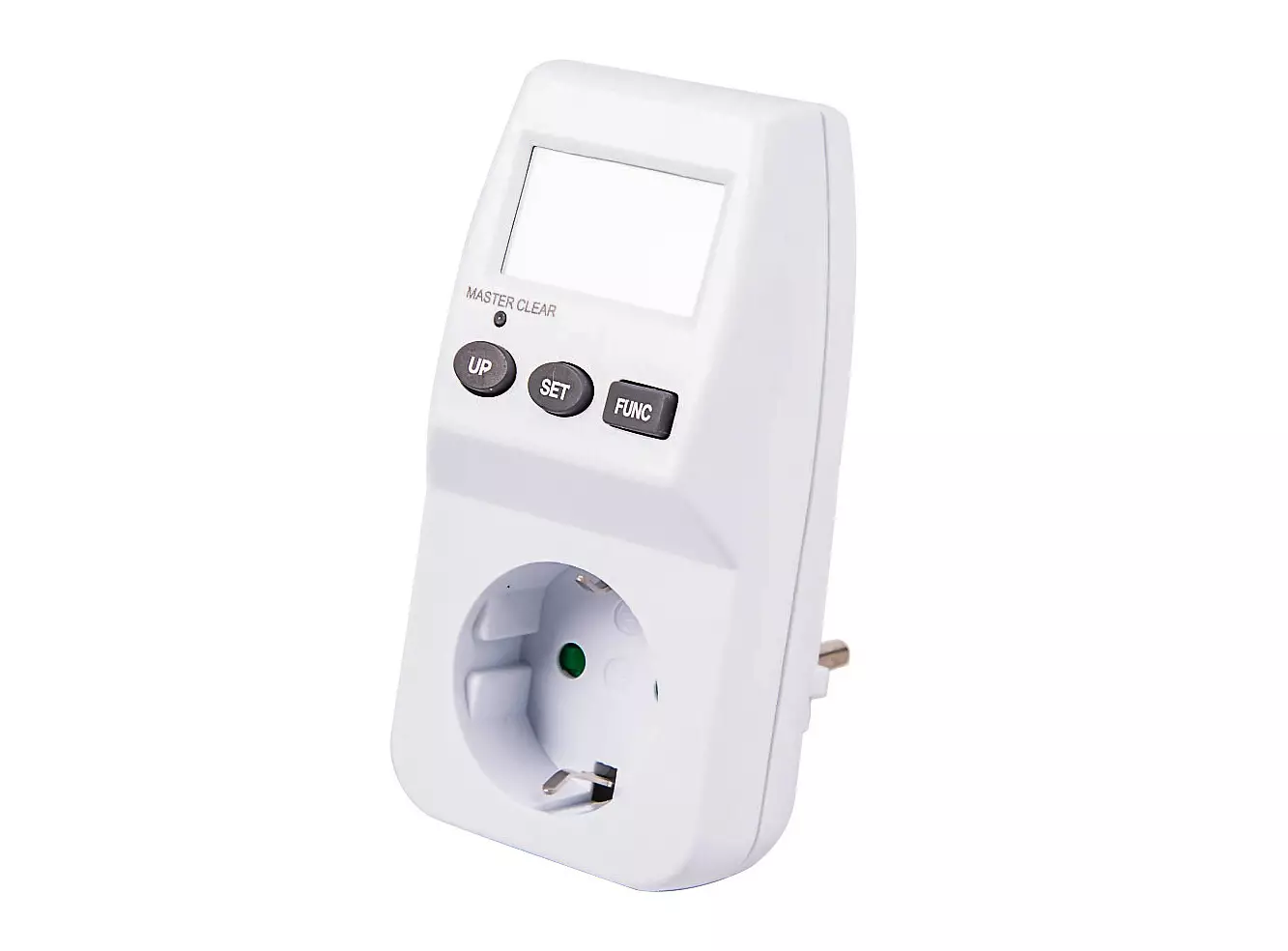 Maksimikuorma: 16 A, 3680 W. Kolme 1,5 V paristoa sisältyy pakkaukseen. IP20.