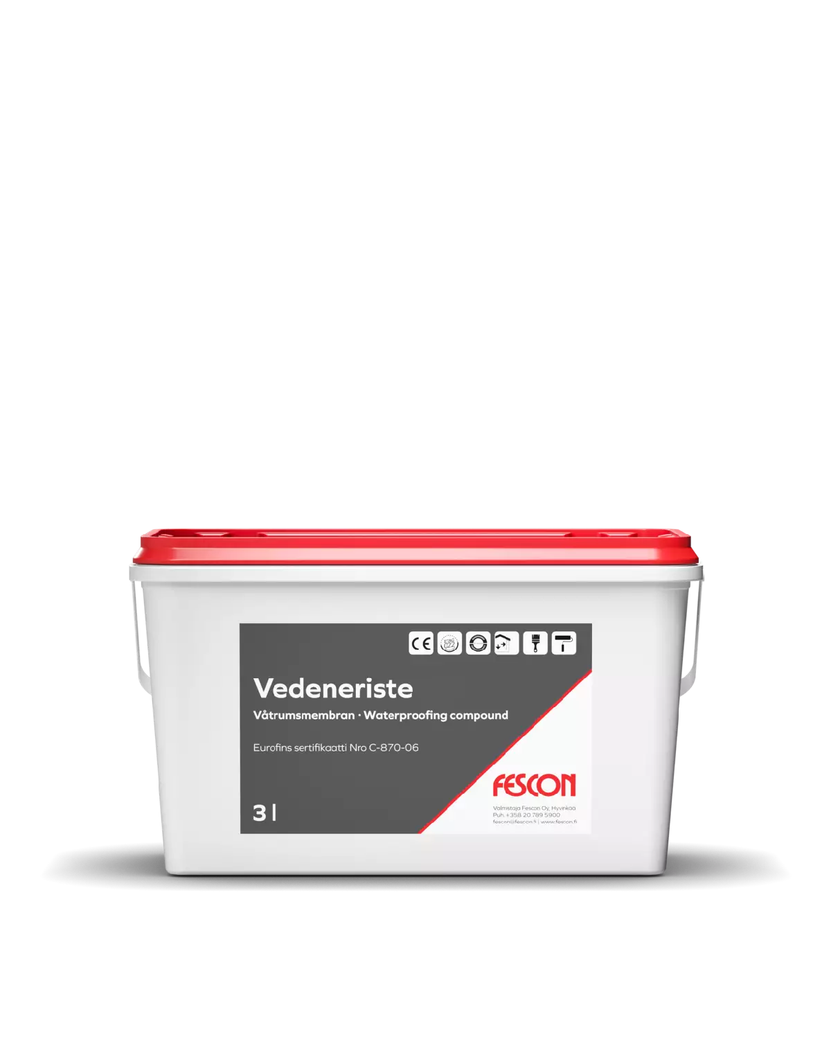 Fescon Vedeneriste on 1-komponenttinen, telattava ja kuituvahvisteinen vedeneriste sisätiloihin. Soveltuu lattioiden ja seinien vedeneristykseen. Vedeneristeen kanssa käytettävät tarvikkeet: Fescon Tartuntapohjuste, Kaivolaippa 300x300 mm kuitu tai Kaivolaippa KL-B, Vedeneristysnauha 0,15 x 25 m ja/tai Vedeneristystarvikkeet FS-sarja. Menekki: n. 0,7 l / m2 seinät, n. 1,0 l / m2 lattiatRiittävä kuivakalvopaksuus helposti kahdella käsittelykerrallaHelposti levittyvä, hyytelömäinenETA -hyväksyttyOsa M1 -hyväksyttyä vedeneristysjärjestelmääEurofins Expert Services Oy tuotesertifikaatti nro C-870-06 KäyttökohteetLaatoitettavien seinä- ja lattiapintojen vedeneristys sisätiloissaBetonielementtien sisäpuolisten saumojen käsittelyyn halkeamien ehkäisemiseksi valmiissa sisäpinnassa Alustana voi olla betoni, sementtipohjainen tasoite tai kosteisiin tiloihin soveltuva rakennuslevy