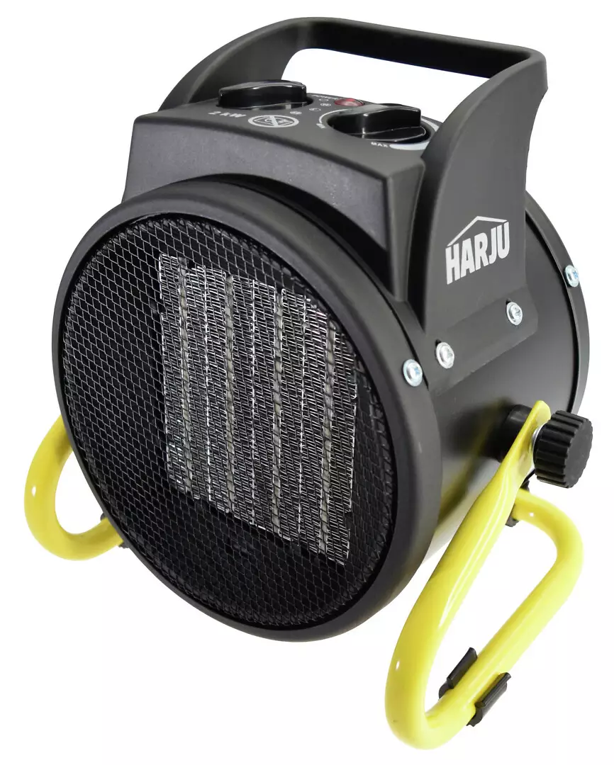 Nopeasti lämpenevällä PTC-lämmitysvastuksella varustettu laadukas Harju lämpöpuhallin, jossa kolme lämmitystehoa. Lämmittimen maksimiteho 2000 W.