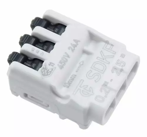 Vipuliitin 3-napainen 5 kpl Tekniset tiedot:Nimellisjännite 450 VNimellisvirta 24 AMax. ympäristön lämpötila T85Johdon kuorimispituus 9 + 1 mmJohtimen paksuus 0.2 - 2.5 mm²