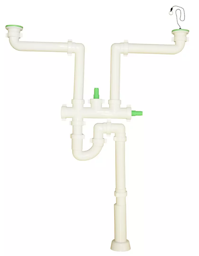 Kaksoisvesilukko on allaskaappitilaa säästävähelposti asennettava malli. Kuulaketju renkain, roskasihti ja seinäpidin sisältyvät toimitukseen. Kaksoisvesilukko oidaan asentaa eritasoaltaille ja myös seinäviemäriin.