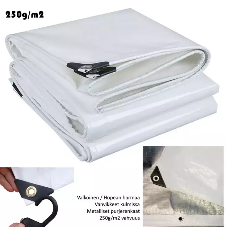 VAIN NOUTO MYYMÄLÄSTÄ KESTOPEITE 10x20m 250g/m2 Valkoinen/hopea pressu Erittäin suuri ja kestävä kestopeite esimerkiksi veneen- tai muiden kohteiden suojaukseen. Kestopeitteen kulmissa... Lue lisää