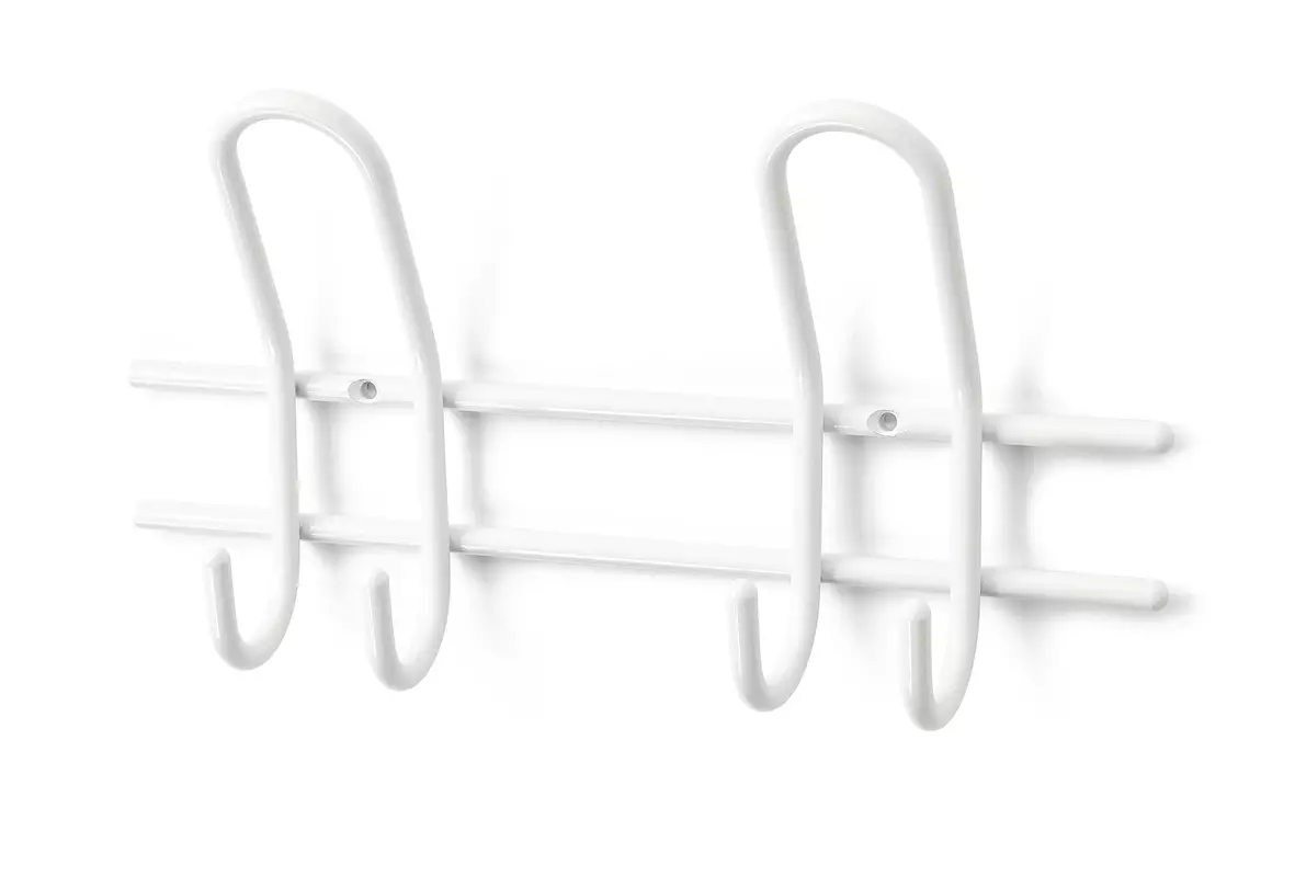 Valkoinen koukkulista 2 koukulla. Ulkonema 67 mm. Materiaali teräs.