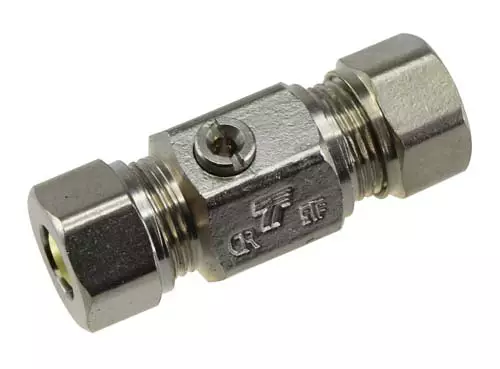 Kromattu kuulasulkuventtiili puserrusliittimillä. STF-tyyppihyväksytty.