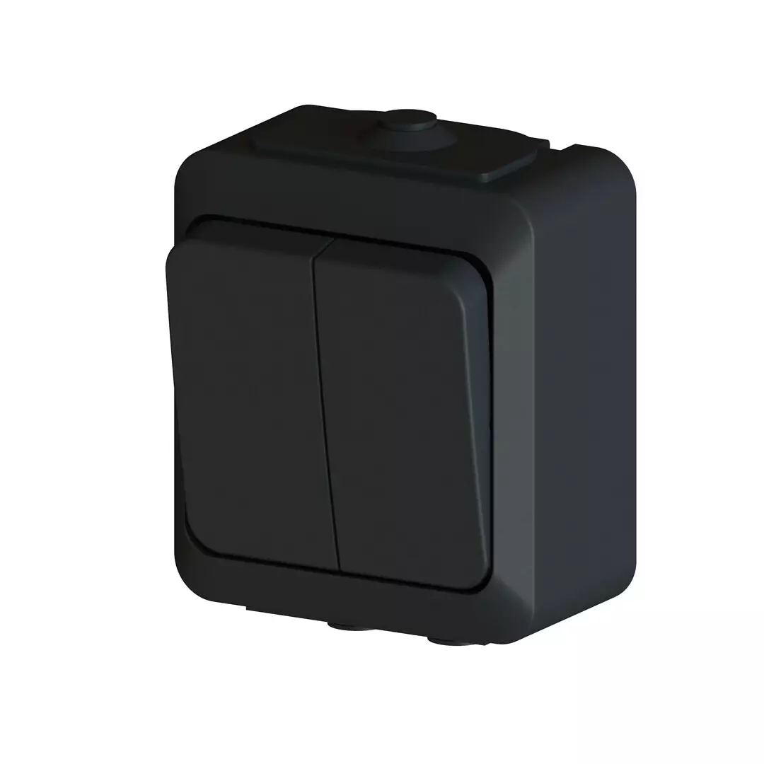 Harju HIILI-sarjan mattamusta pinta-asennettava roiskevesitiivis kruunukytkin, joka soveltuu myös kosteisiin tiloihin ja ulkokäyttöön. Kytkentä ruuviliittimin. Kotelointiluokka IP44. HIILI on Harjun uusi tyylikäs mattamusta sähkökalustesarja pinta- ja uppo-asennuksiin.