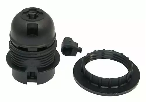Kierteellä, renkaalla, vedonpoistonipalla ja E27-kannalla varustettu lampunpidin. M10 kierre. Jousiliittimet.