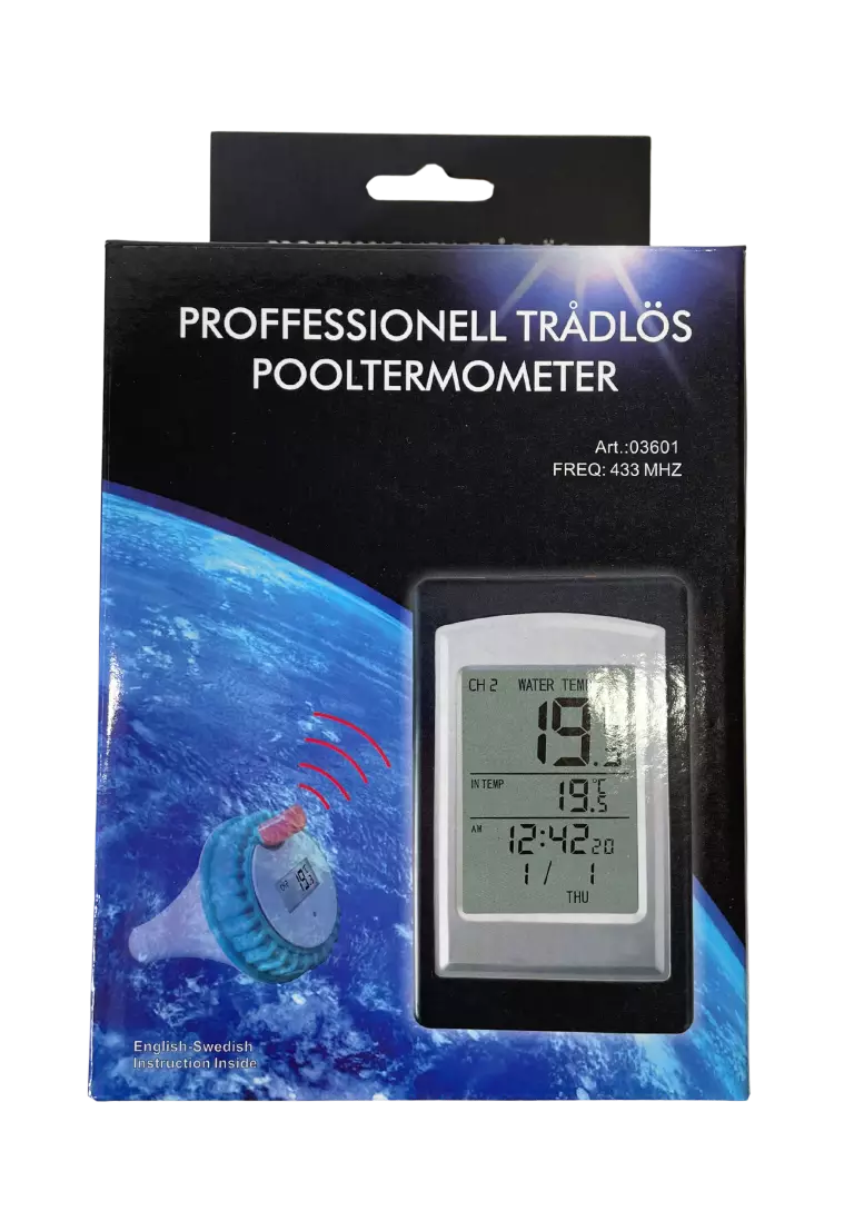 Langaton allaslämpömittari vedenpitävällä allaslähettimellä. Näyttää veden lämpötilan ja sisälämpötilan. Mukana on myös kello, jossa on hälytystoiminto ja kalenteri. Min/max-muisti korkeimmalle/alimmalle lämpötilalle. Kantama noin 50 metriä vapaassa tilassa ilman häiritseviä esteitä.
