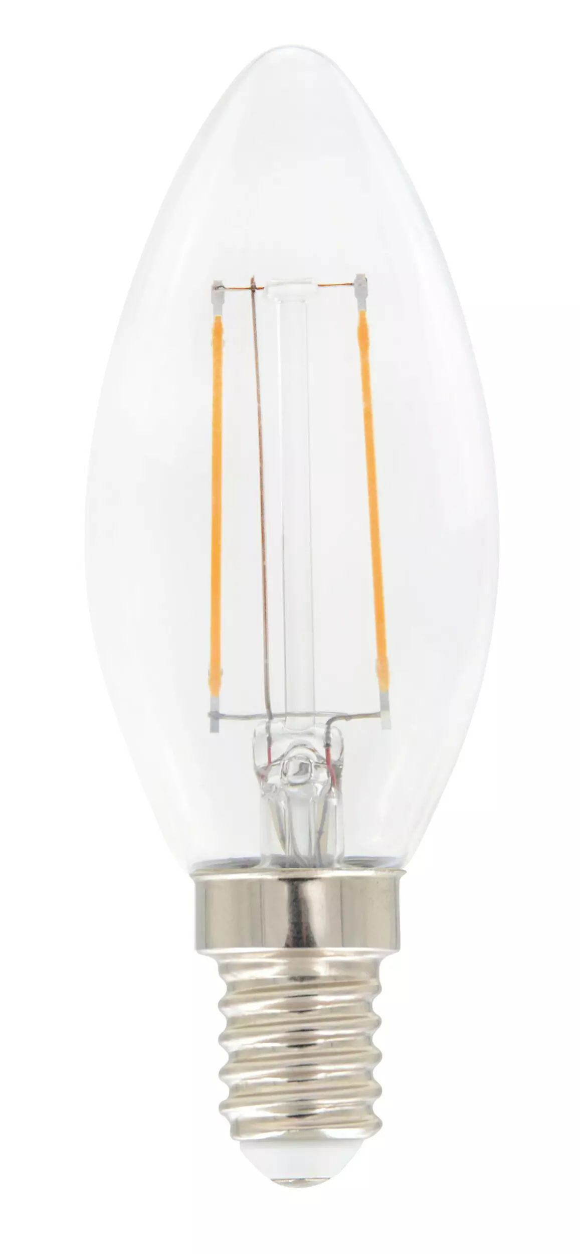 Kirkas kynttiläkupuinen filamentti led-lamppu 1,4W, värilämpötila lämmin valkoinen 2700K, E14-kanta, 136lm, polttoikä n. 15000h, koko ø 35 x 97 mm, pahvipakkaus. Taajuus ~50/60Hz. Lampulla täysin ympärisäteilevä valonjako, sopii hyvin plafondeihin ja pöytävalaisimiin. Toimintalämpötila-alue -30 ... +40 °C. Hyvä värintoistoindeksi CRI > 80. Jatkuva tasainen spektri, ei värivääristymiä. Ei UV- tai IR-säteilyä. Ei sisällä elohopeaa. Kolmen vuoden takuu.