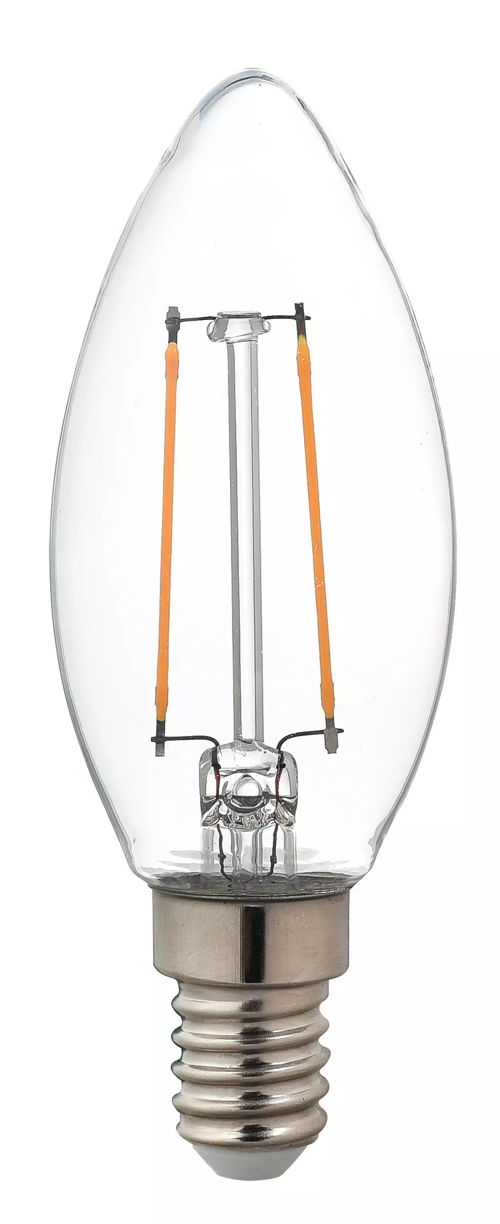 Kirkas kynttiläkupuinen filamentti led-lamppu 2,5W, värilämpötila lämmin valkoinen 2700K, E14-kanta, 250lm, polttoikä n. 15000h, koko ø 35 x 97 mm, pahvipakkaus. Taajuus ~50/60Hz. Lampulla täysin ympärisäteilevä valonjako, sopii hyvin plafondeihin ja pöytävalaisimiin. Toimintalämpötila-alue -30 ... +40 °C. Hyvä värintoistoindeksi CRI > 80. Jatkuva tasainen spektri, ei värivääristymiä. Ei UV- tai IR-säteilyä. Ei sisällä elohopeaa. Kolmen vuoden takuu.