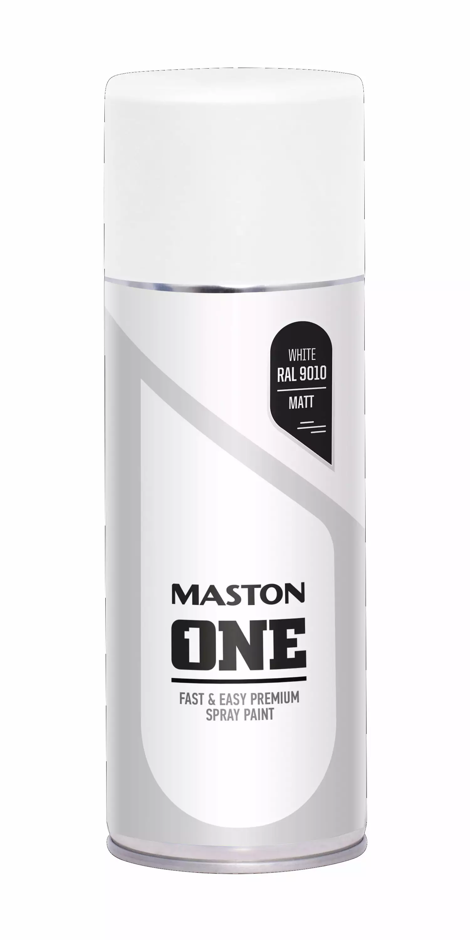 Maston One® spraymaali – tekee maalauksesta helppoa ja nopeaa. Maston One® akryylimaali soveltuu käytännössä kaikille pinnoille, sisälle ja ulos. Maston One® -maalisarjassa kaikki mitä tarvitset, pohjamaalit, pintamaalit jos lakat kaikissa kiiltoisuuksissa sekä useassa eri värivaihtoedossa. Maalilla on erinomainen tarttuvuus.<br /><br />Maston One® ainutlaatuisen teknologian ansiosta suihkutusetäisyys on vain 15cm, tämä tarkoittaa tarkempaa maalauskokemusta, vähemmän maalipölyä eikä maalin valumia. <br /><br />Maston One® tuotteessa on helppokäyttöinen viuhkasuutin, jota on vaivatonta käyttää. Viuhkasuuttimen ansiosta saat maalattua valmista pintaa nopeasti, puhumattakaan sensaatiomaisen nopeasta kuivumisajasta – vain 15 minuuttia kosketuskuivaksi! <br />(Pohjamaali hiottavissa 30-60min kuluttua)<br /><br />Suosittelemme ensin pohjamaalia tai muovipinnalle muovipohjamaalia.<br /><br />Riittoisuus: 2m2 (400ml), 0,75m2 (150ml)<br />Kuivumisjat: 15 min kosketuskuiva, kuiva 24h.