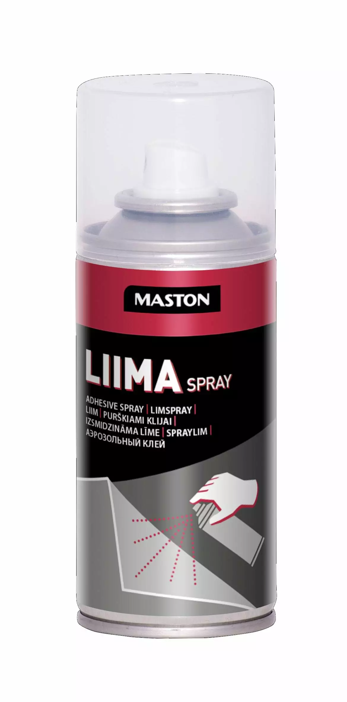 Maston Sprayliima on nopeasti kuivuva sprayliima kevyiden materiaalien kiinnittämiseen. Sopii paperin, pahvin, kankaan, huovan, kumin, lasikuidun, styroxin ja useimpien muovien kiinnittämiseen. Ei sovellu vinyylimuoville eikä vinyylillä päällystellyille pinnoille. Kiinnittyy lähes kaikille sileille ja karheille pinnoille. Ei imeydy liimattavaan pintaan. Tuote on lähes väritön. Hylkii vettä. Käyttöohje: Ravista purkkia 1 min. ennen käyttöä, sekä ajoittain myös käytön aikana. Liiman ja liimattavien tuotteiden tulee olla huoneenlämpöisiä (+16 °C - +32 °C). Suihkuta noin 20 cm:n etäisyydeltä. Anna liiman kuivahtaa tahmeaksi ennen pintojen liittämistä toisiinsa. Väliaikainen kiinnitys: Suihkuta yksi kerros vain toiselle liimattavalle pinnalle ja liitä yhteen. Pysyvä kiinnitys: Suihkuta yksi kerros molemmille liimattaville pinnoille.Puhdista suutin käytön jälkeen kääntämällä purkki ylösalaisin ja paina suutinta kunnes purkista tulee ulos vain ponneainetta.