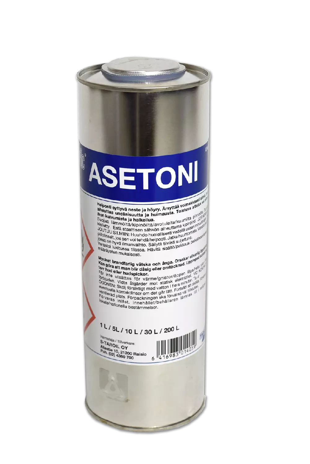 Asetoni 1 L Maalin, lakkojen ja liimojen ohentamiseen, sekä liima- ja maalitahrojen puhdistukseen.