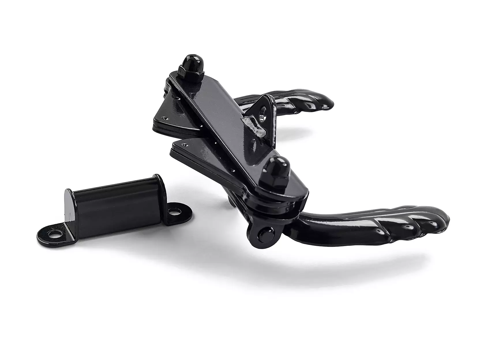 Teräksinen porttilukko. Puu- tai teräsporteille. Suositeltu väli tolpan ja portin välillä vähintään 65 mm. Mukana ruuvit.