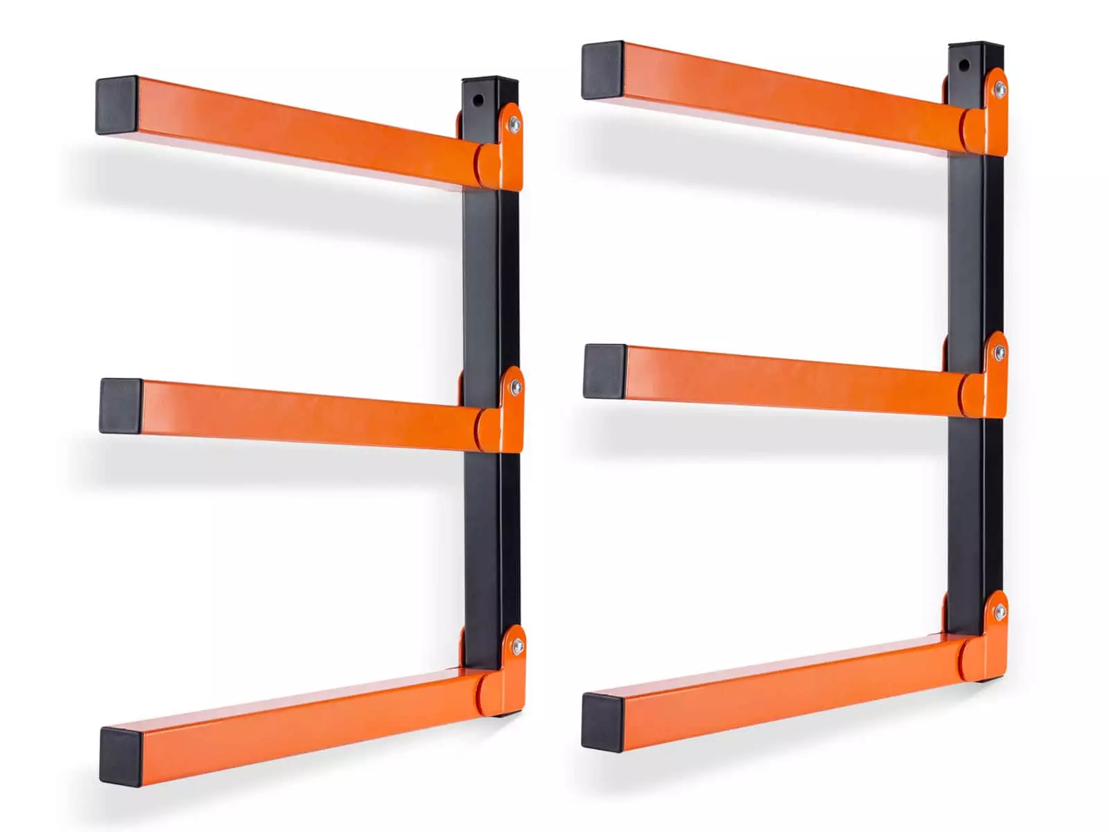 Telineessä on kolme tukevaa tasoa, jotka ovat käännettävissä ylös, kun teline ei ole käytössä.