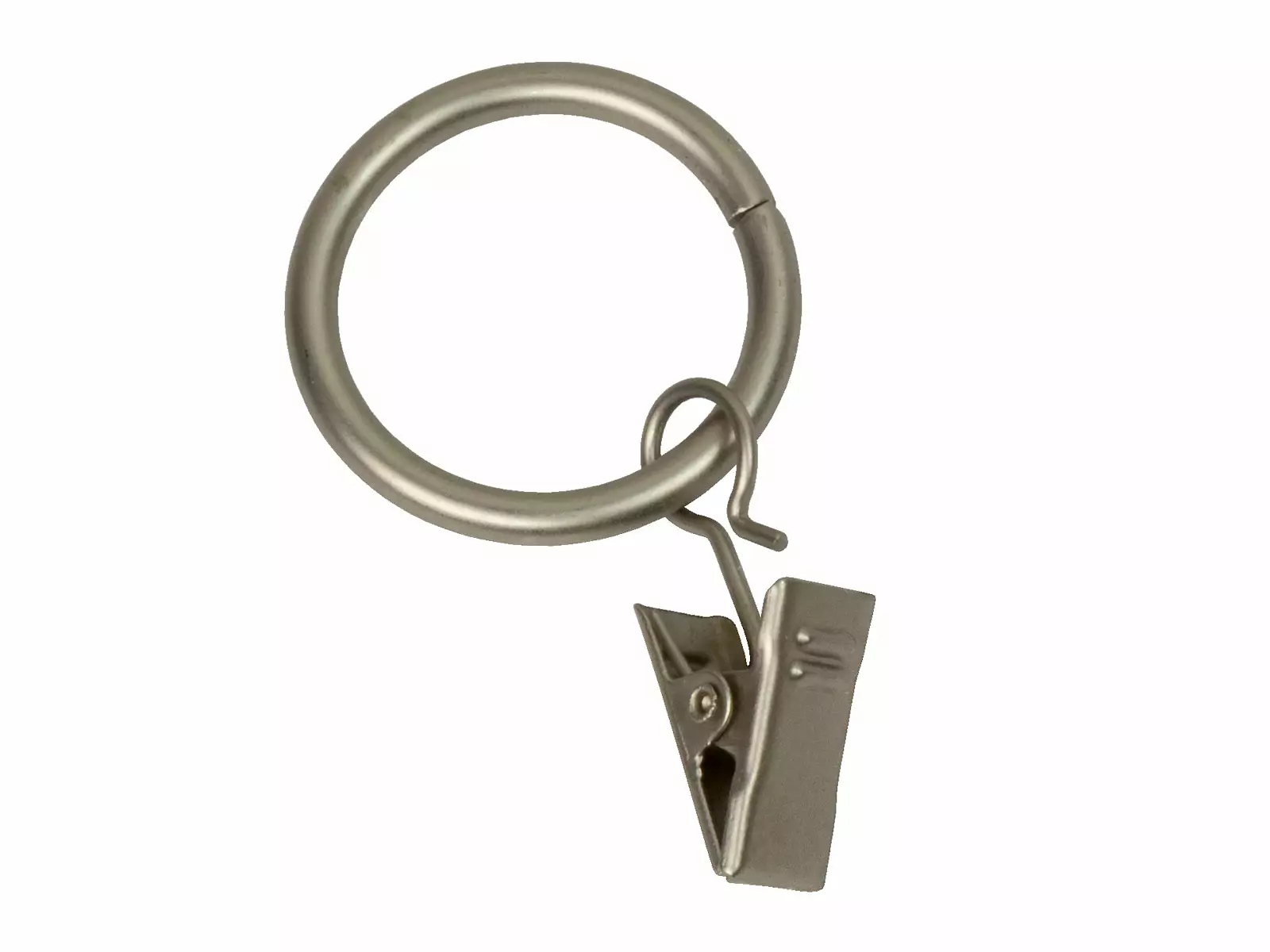 Metallinen verhorengas nipistimellä, renkaan sisähalkaisija 25 mm. Paketissa 10 kpl.