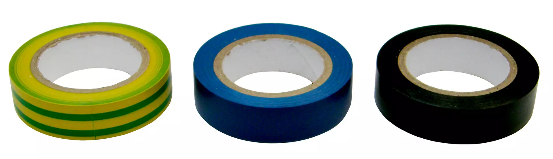 Sähköteippirullien väreinä musta, sininen ja kelta-vihreä.