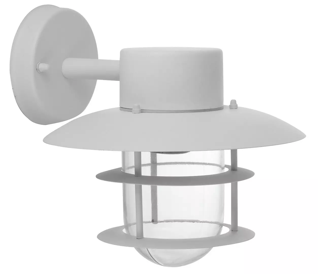Harjun tyylikäs valkoinen RAHOLA seinävalaisin yläkiinnityksellä. Valaisimen runko on tukevaa terästä ja kupu kirkasta lasia. RAHOLA tuoteperheen valaisimet sopivat erinomaisesti suomalaiseen pihamaisemaan.
