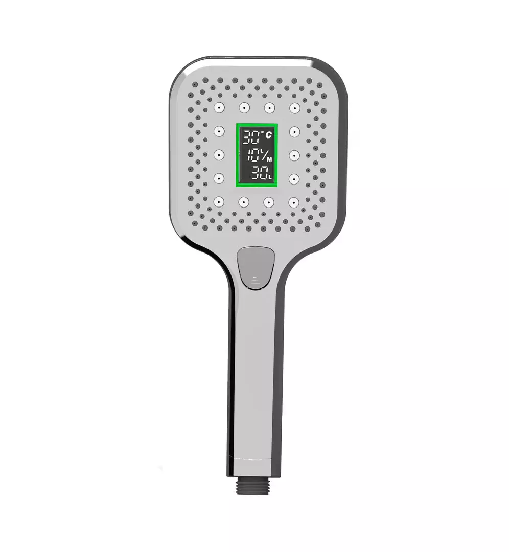 Led-näytöllä varustettu käsisuihku kertoo tarkan tiedon veden lämpötilasta, kulutuksen l/min, sekä kokonaiskulutuksen suihkukerralta. Led-valon väri vaihtuu veden kulutuksen mukaan: 60 l - punainen. Led-suihku saa energiansa veden virtauksesta, joten paristoja ei tarvita. Suihkussa on 3 erilaista suihkutoimintoa.