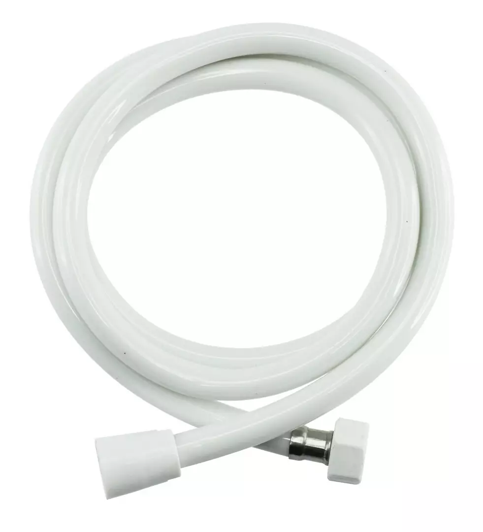 Valkoinen suihkuletku PVC-muovia. Liittimet 1/2" messinkiä.