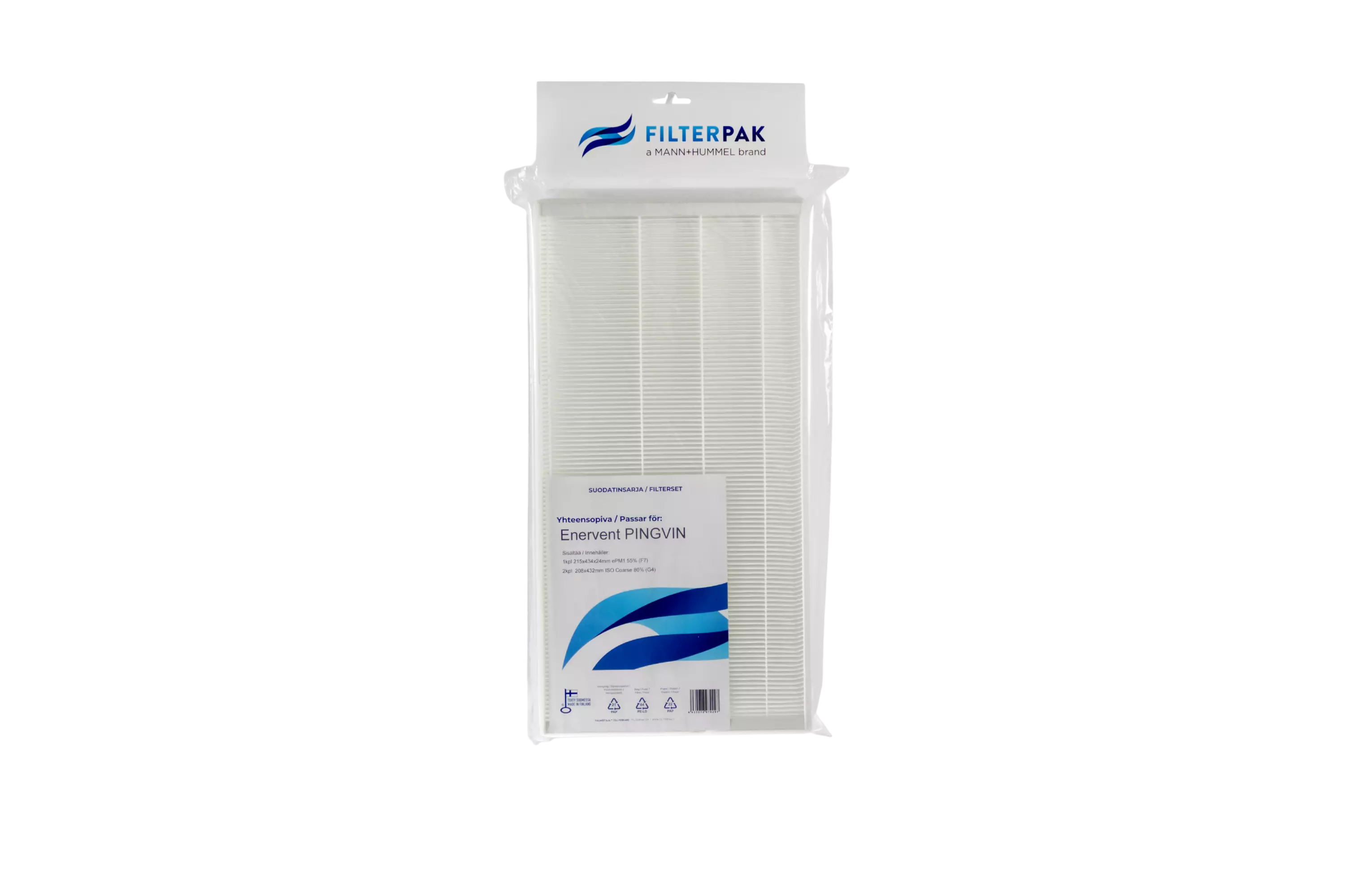 Suomessa valmistettu FILTERPAK pientalosuodatinpakkaus. Yhteensopiva Enervent PINGVIN 60/65/80/85/120 mallien kanssa.Paketti sisältää: 1 kpl 215x434x24 mm ePM1 55% (F7)/2 kpl 208x432 mm ISO Coarse 80% (G4)