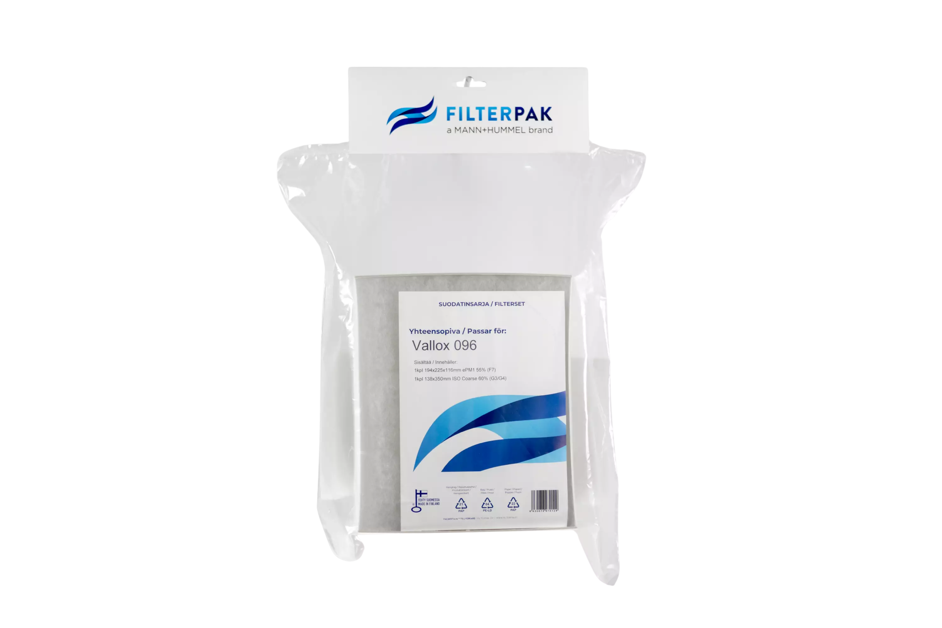 Suomessa valmistettu FILTERPAK pientalosuodatinpakkaus. Yhteensopiva Vallox 096 mallien kanssa. Vallox nro 27. Paketti sisältää: 1 kpl 194x225x116 mm ePM1 55% (F7)/1 kpl 138x350 mm ISO Coarse 60% (G3/G4)