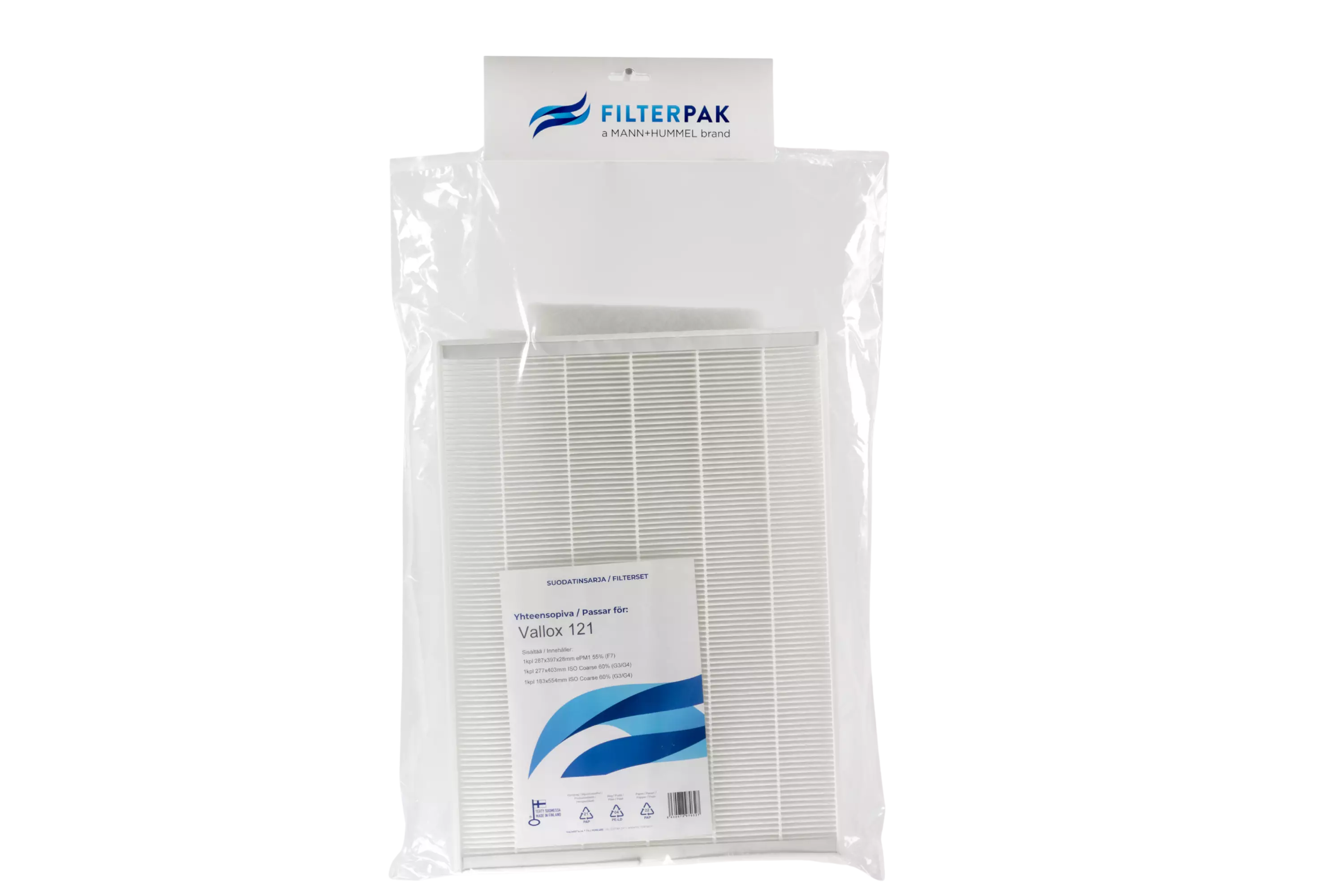 Suomessa valmistettu FILTERPAK pientalosuodatinpakkaus. Yhteensopiva Vallox 121 mallien kanssa. Vallox nro 21. Paketti sisältää:1 kpl 287x397x28 mm ePM1 55% (F7)/1 kpl 277x403 mm ISO Coarse 60% (G3/G4)/1 kpl 183x554 mm ISO Coarse 60% (G3/G4)