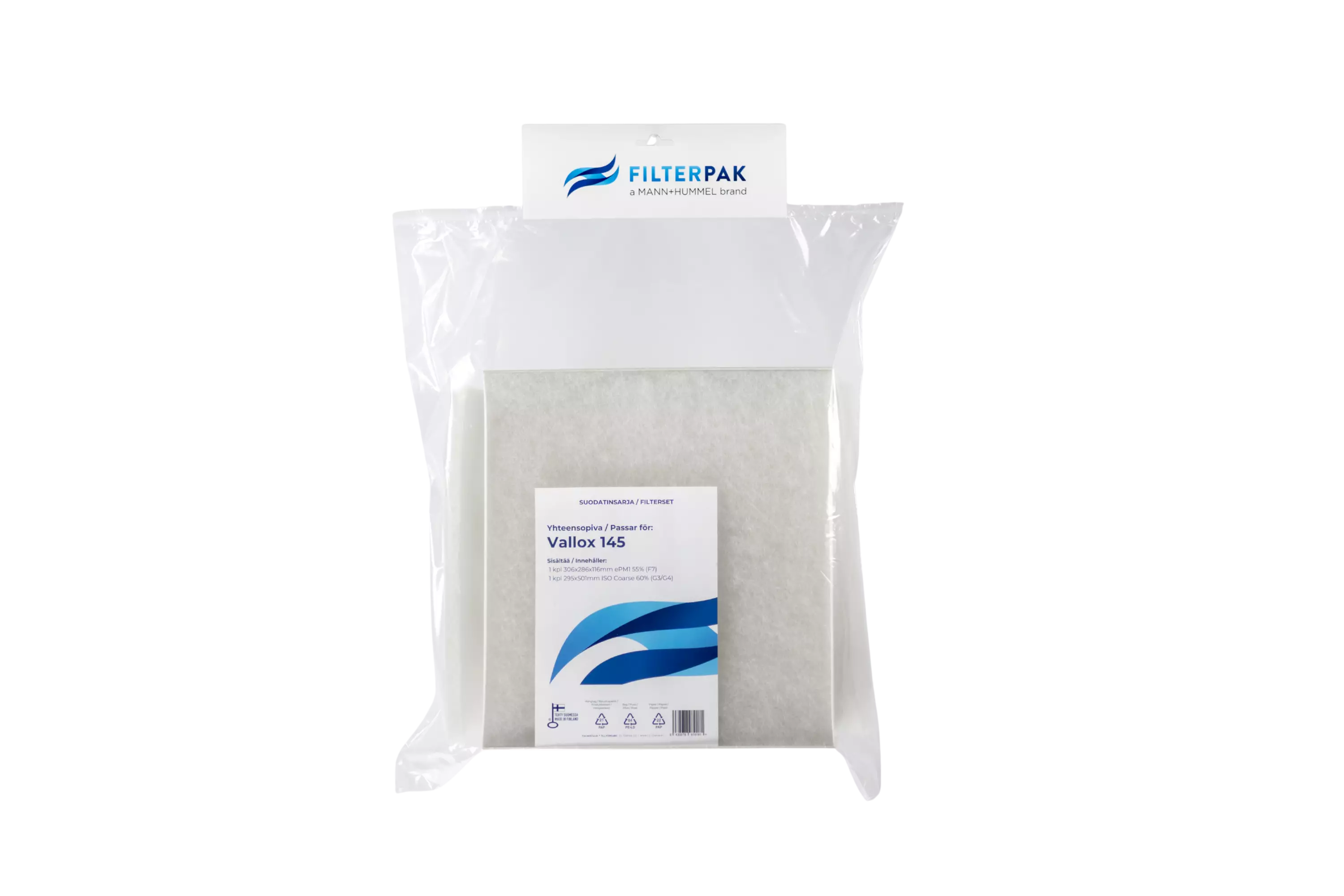 Suomessa valmistettu FILTERPAK pientalosuodatinpakkaus. Yhteensopiva Vallox 145 mallien kanssa. Vallox nro 28. Paketti sisältää: 1 kpl 306x286x116 mm ePM1 55% (F7)/1 kpl 306x286 mm ISO Coarse 60% (G3/G4)/1 kpl 295x501 mm ISO Coarse 60% (G3/G4)