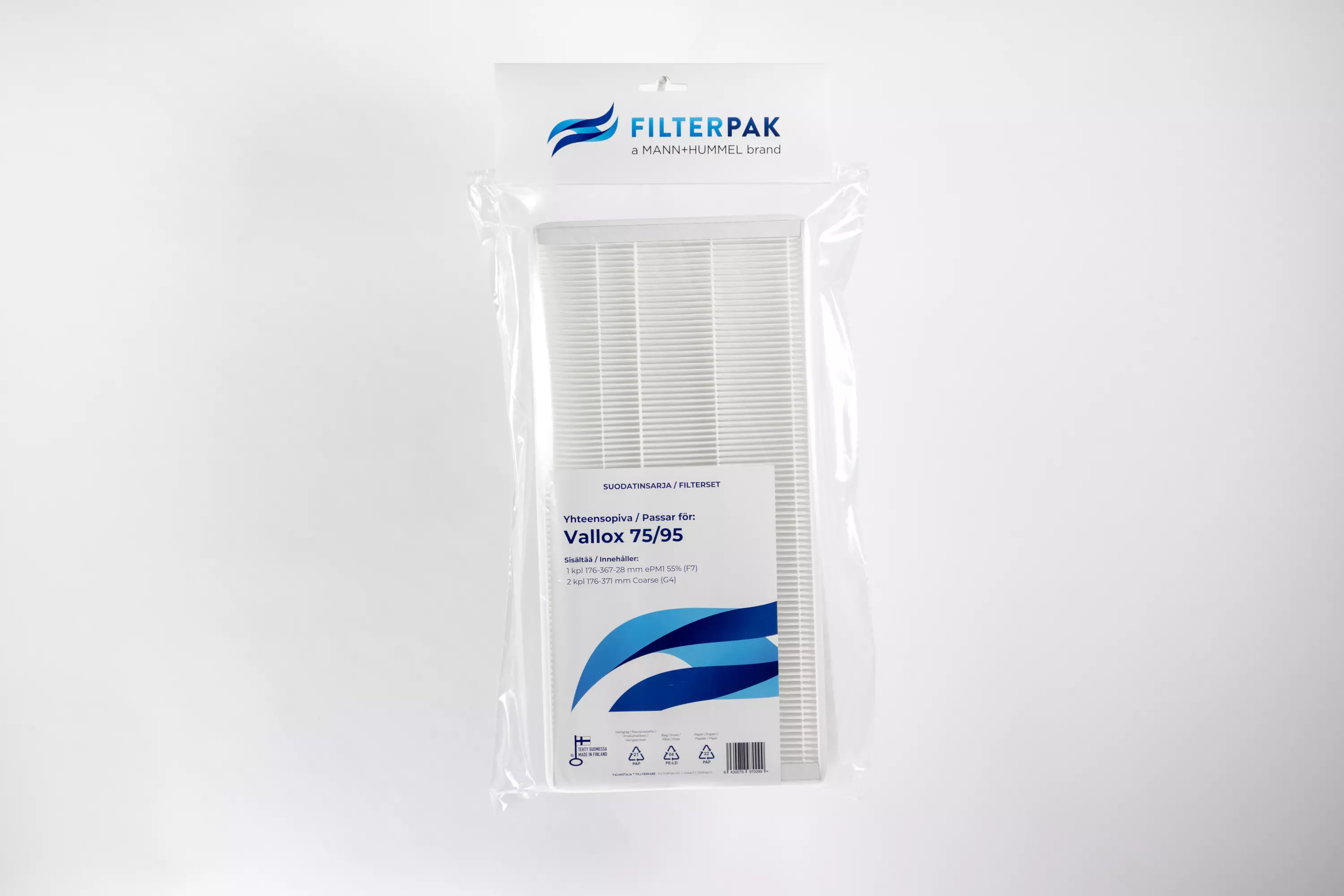 Suomessa valmistettu FILTERPAK pientalosuodatinpakkaus. Yhteensopiva Vallox 75 ja 95 mallien kanssa. Vallox nro 12. Paketti sisältää: 1 kpl 176x367x28 mm ePM1 55% (F7)/2 kpl 176x371 mm Coarse 60% (G3/G4)