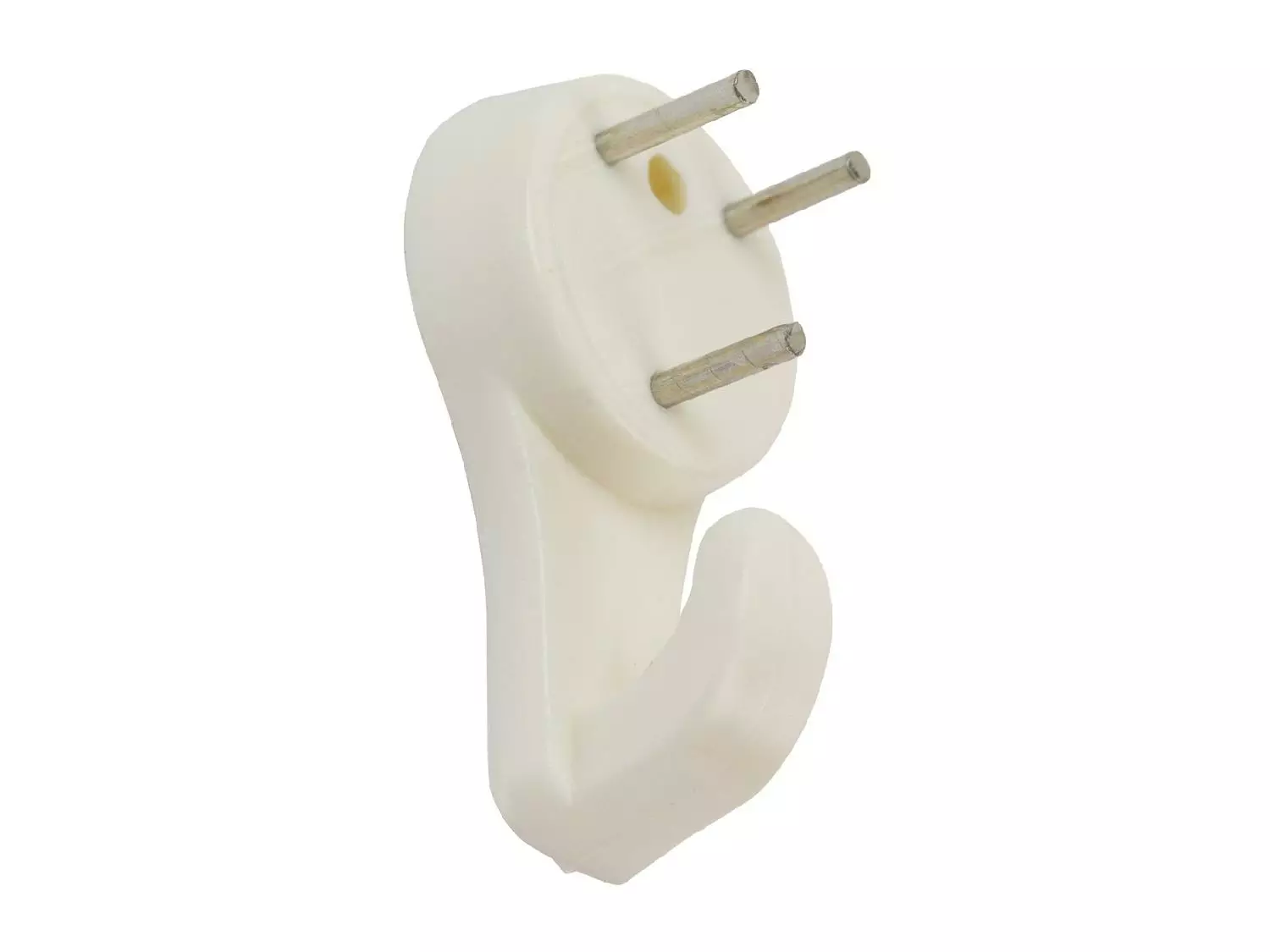 Keskikokoinen taulukoukku. Väri valkoinen. Muovinen kolmella naulalla. 5 kappaletta paketissa. Kantavuus 4 kg.