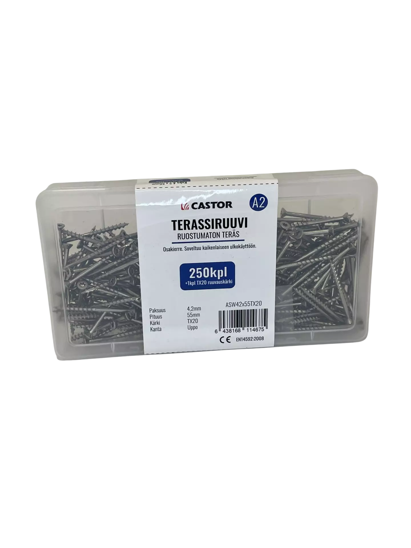 Leikkaava kärki, osakierre ja senkkaava uppokanta. A2 ruostumaton teräs. Muovibox 250 kpl + torx 20 ruuvauskärki
