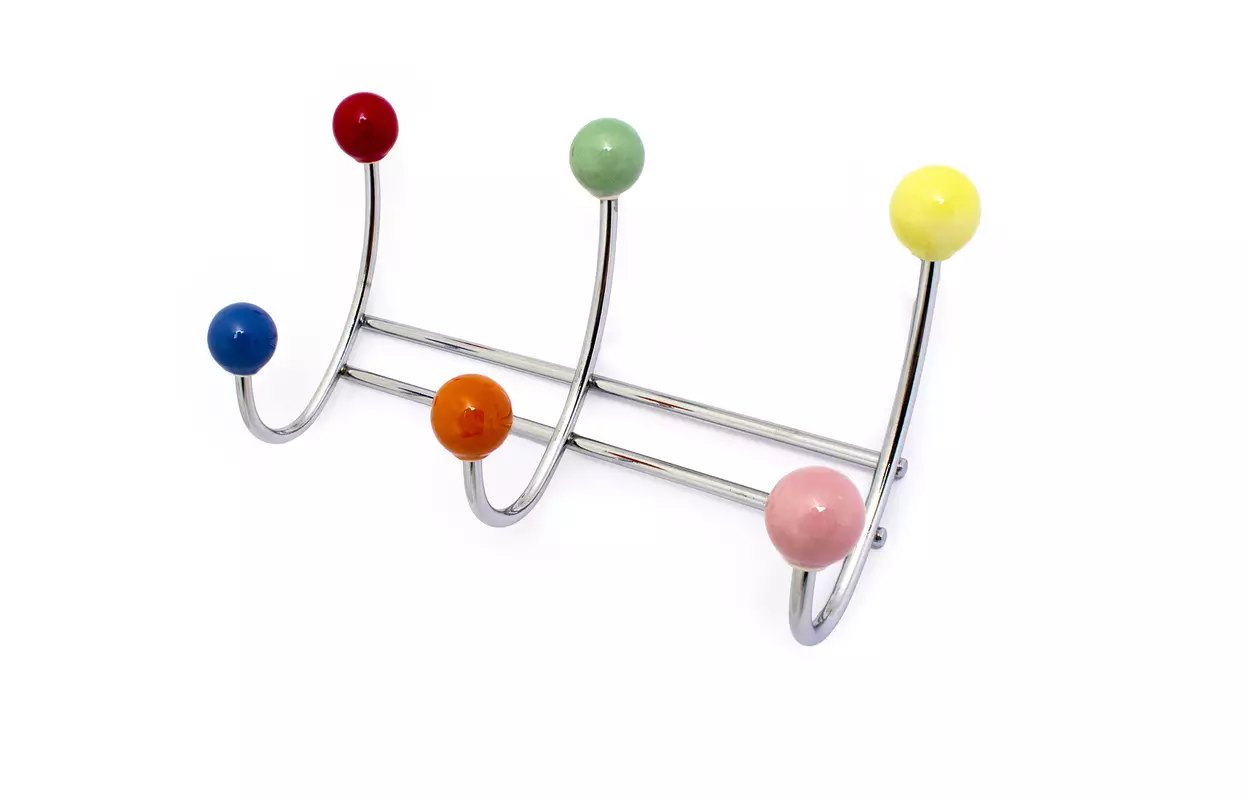 Naulakko kromattua terästä, moniväriset posliininupit. Sopii yhtä hyvin lastenhuoneeseen kuin eteiseenkin. Naulakko, jossa reilusti tilaa vaatteille, käsineille, pusseille jne.