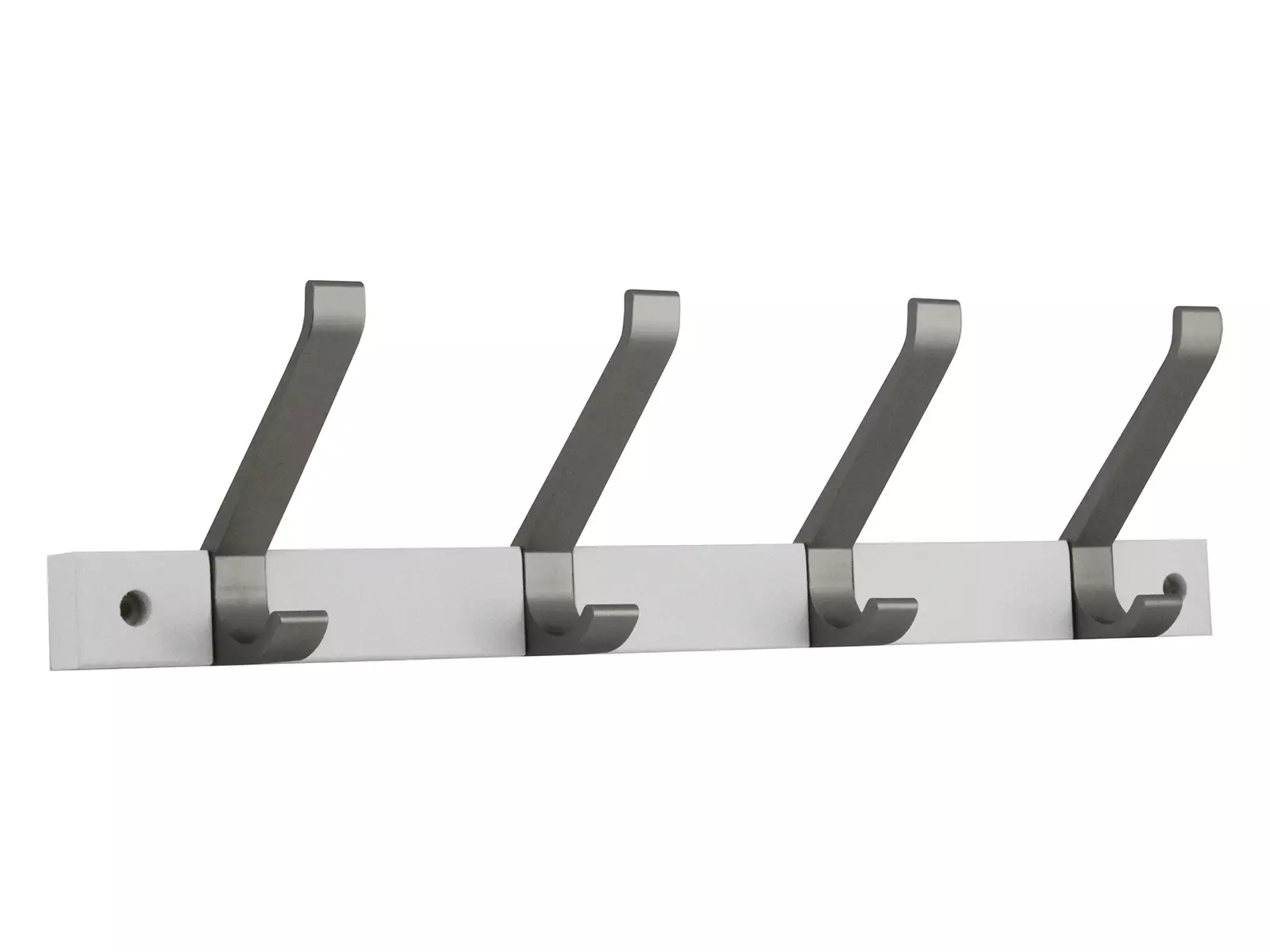 Tyylikäs 4- koukkuinen naulakko. Taustaosa maalattua puuta ja upotetut koukut niklattua alumiinia.