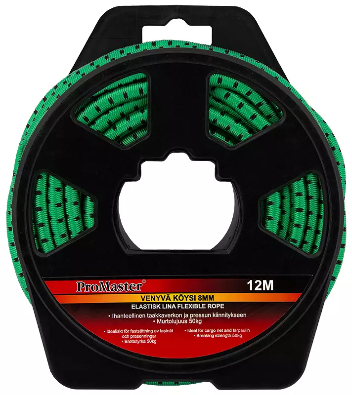 ProMaster -ihanteellinen taakkaverkon ja pressun kiinnitykseen-köyden:--pakuus 8 mm--pituus 12 m-murtolujuus 50 kg-IP-ripustinpakkaus