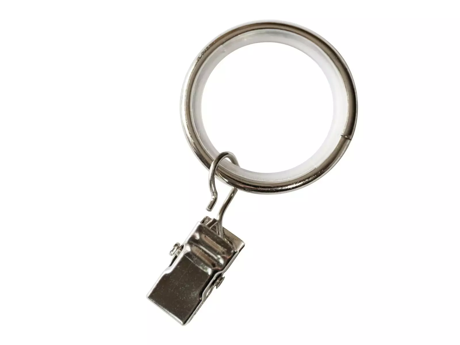 Metallinen verhorengas nipistimellä, renkaan sisähalkaisija 25 mm.